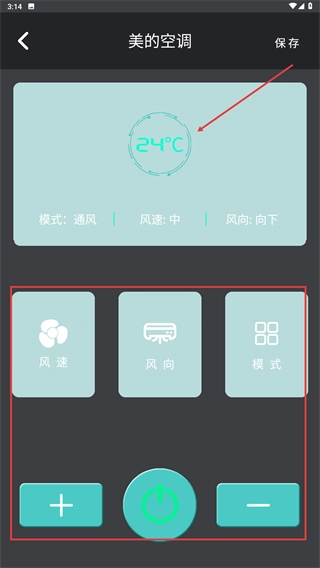 4、进入“美的空调”控制页面后,可通过风速、风向、模式等按钮调整设备参数,也可通过加减键调节温度。