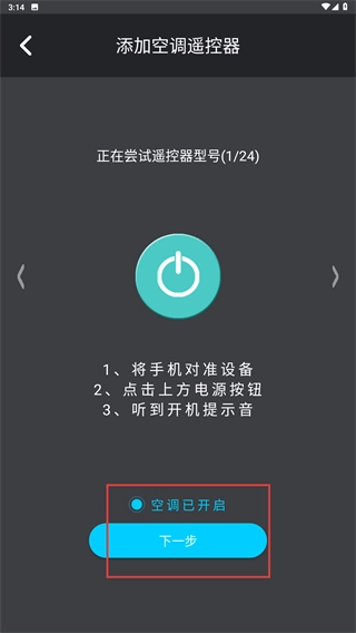 3、在“添加空调遥控器”页面,按提示将手机对准设备并点击电源按钮,确认设备响应后选择【空调已开启】,点击【下一步】完成匹配。