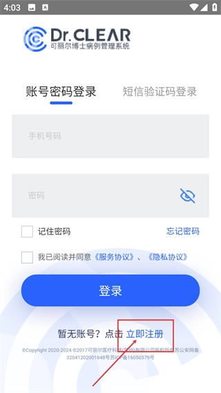1、进入可丽尔博士病例管理系统登录页,点击“立即注册”进入注册流程。