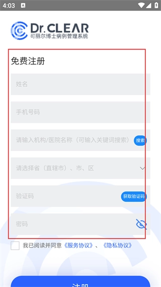 2、进入免费注册页面,需依次填写“姓名”“手机号码”,搜索并选择所属机构/医院名称,完成信息填写后点击注册按钮提交信息。