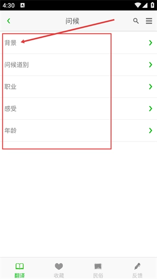 2、进入“问候”分类的子分类页面,可选择“背景”“问候道别”等细分内容类型,进一步精准筛选所需翻译的内容方向。