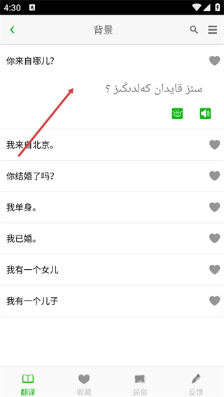 3、进入“背景”子分类页面,可查看该类别下的具体交流语句(如“你来自哪儿?”“我来自北京。”等)。