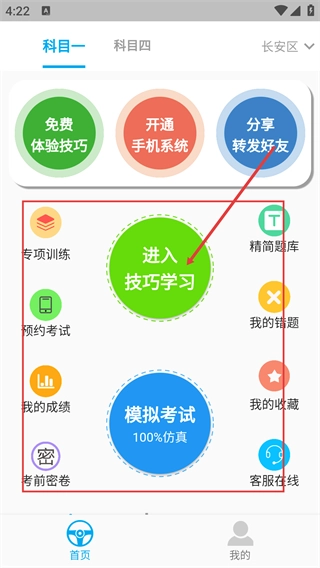 2、进入科目一主界面,可切换科目一/科目四,界面包含专项训练、模拟考试等功能;点击“进入技巧学习”按钮。