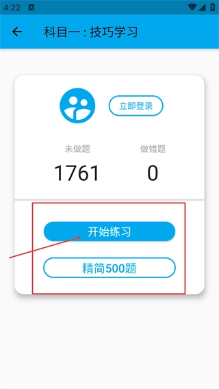 3、进入科目一技巧学习页面,可查看未做题、做错题数量;点击“开始练习”按钮可进入全题库刷题,也可选择“精简500题”进行重点练习。
