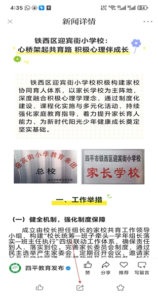 3、进入新闻详情页,查看文章内容及工作举措等信息后,点击页面中的分享按钮。
