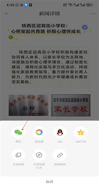 4、在弹出的分享界面中选择微信等渠道,即可将这篇新闻内容分享给对应联系人。