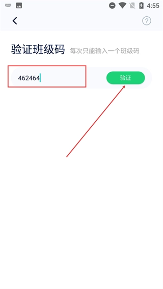 3、在【验证班级码】页面,输入对应班级码(如【462464】),点击【验证】按钮完成班级绑定。