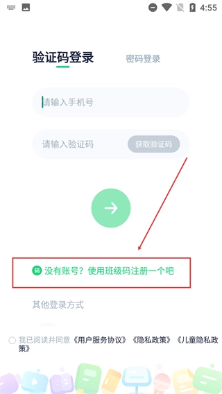 2、进入【验证码登录】界面,若暂无账号,点击【没有账号?使用班级码注册一个吧】选项进行注册。