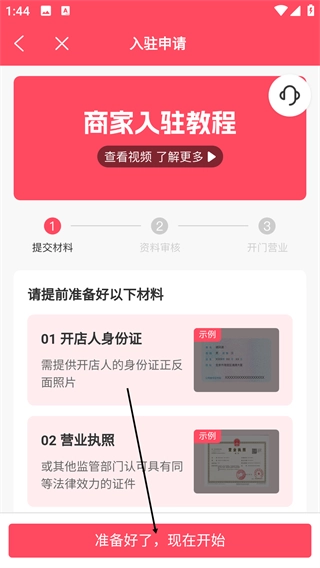 4、准备好身份证、营业执照等材料后,点击【准备好了,现在开始】按钮,进入入驻材料提交流程。