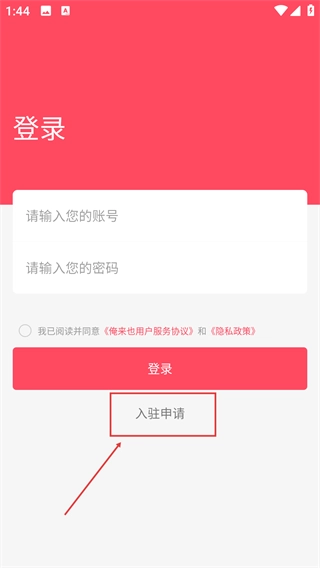 1、在登录界面点击【入驻申请】选项,进入商家注册类型选择页面。