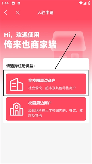 2、在入驻申请页面选择注册类型(如“非校园周边商户”),进入商家权益介绍界面。