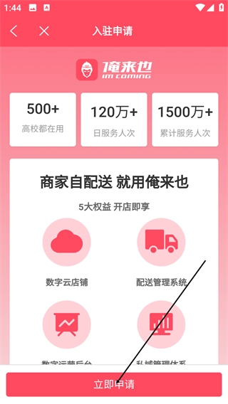3、在权益介绍界面点击【立即申请】按钮,进入商家入驻教程页面。