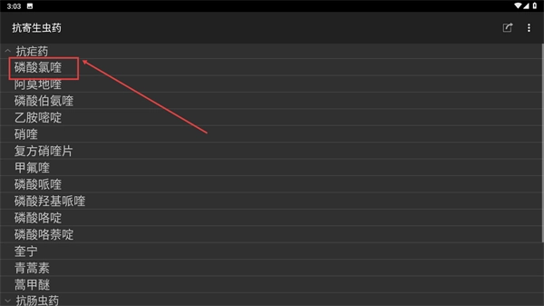 3、在抗寄生虫药的细分列表里,选择【磷酸氯喹】,进入该药物的详情页面。