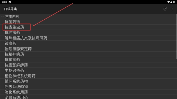 2、在常用西药的子分类中,点击【抗寄生虫药】,查看该类别下的具体药物条目。