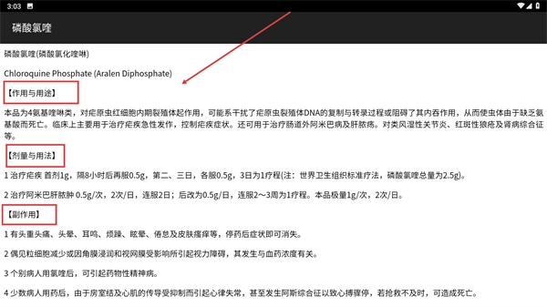 4、进入磷酸氯喹详情页后,能够查看【作用与用途】【剂量与用法】【副作用】等信息,从而了解该药物的临床相关内容。