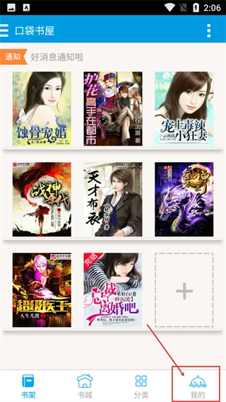 1、打开【口袋书屋】的书架页面后,能看到已添加的书籍,要是想进入个人中心,点击底部导航栏的【我的】按钮就行。