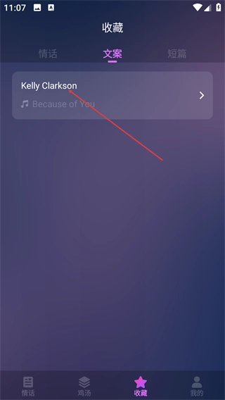 2、切换到【鸡汤】分类的【文案】页,找到目标内容后,点击【收藏】按钮,可将该文案保存到收藏夹。