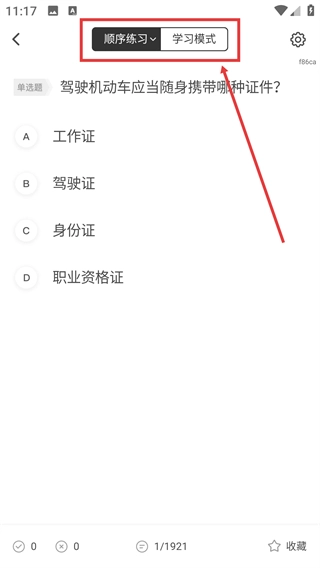 3、进入刷题界面后,可通过顶部的【顺序练习】-【学习模式】选项,切换刷题的模式与顺序。