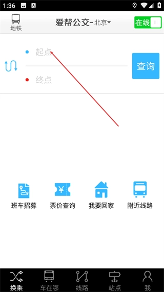 2、进入主界面后,在【起点】和【终点】栏中分别填写行程的出发地与目的地,点击【查询】按钮,即可获取对应的公交换乘路线信息。