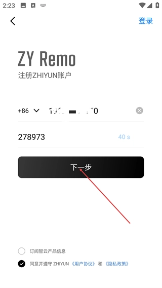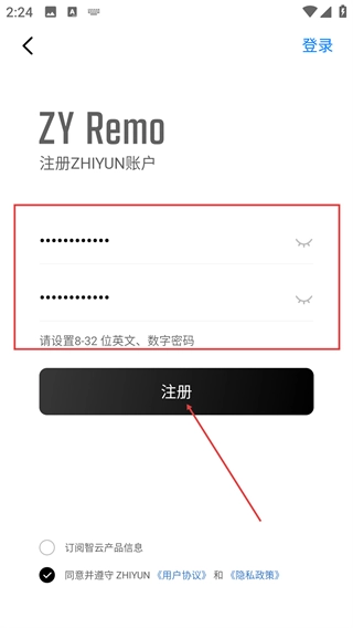 4、设置8-32位英文+数字组合的密码(需重复确认),点击【注册】按钮,完成账号注册,即可使用该应用关联智云设备(如遥控器等)。