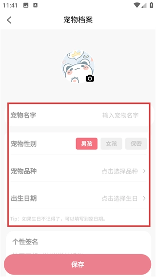 2、在【宠物档案】页,需填写【宠物名字】-【宠物性别】-【宠物品种】-【出生日期】等信息,完善宠物基础资料。