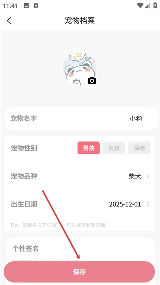 3、填写完宠物档案信息后,点击底部的【保存】按钮,即可完成宠物信息的提交与创建。