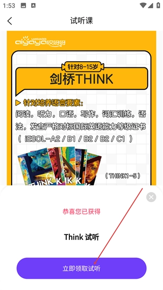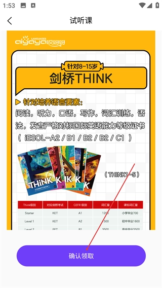 3、在试听课页面,查看剑桥THINK课程(针对8-15岁,覆盖听、说、读、写等语言要素)的详情后,点击【确认领取】。