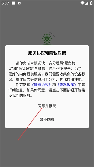 1、进入应用后,阅读《服务协议》和《隐私政策》条款,点击【同意并接受】以继续使用服务。
