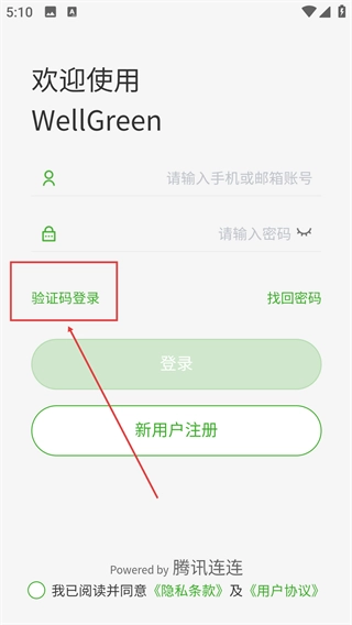 2、在WellGreen登录页,选择【验证码登录】方式,切换至手机号+验证码的登录界面。