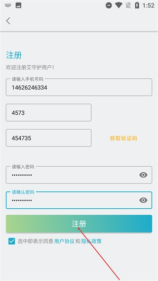 4、在注册页填写【手机号码】【验证码】【密码】(需重复确认),勾选协议后点击【注册】按钮,完成账号注册。
