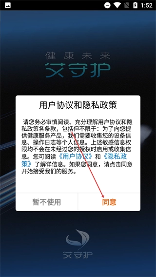 1、在“艾守护”应用启动时,阅读《用户协议和隐私政策》后,点击【同意】按钮,进入应用引导页。