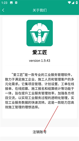 4、在【关于我们】页面,可了解“爱工匠”(工业服务管理软件)的功能定位,也可点击【注销账号】完成账号注销操作。