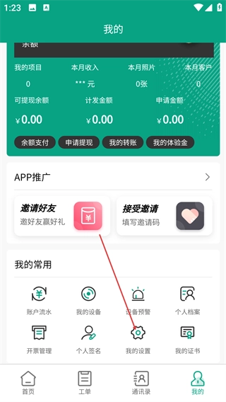 1、在【爱工匠】首页点击底部【我的】按钮,进入个人中心页面,可查看账户信息与功能入口。