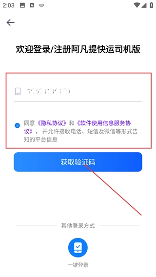 3、进入登录或注册页面,填写手机号码,勾选相关协议后,点击【获取验证码】按钮,输入收到的验证码,就能完成登录或注册操作。