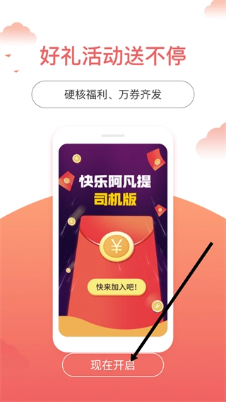 1、在“快乐阿凡提(司机版)”的活动引导页面,点击【现在开启】按钮,即可进入应用服务流程。