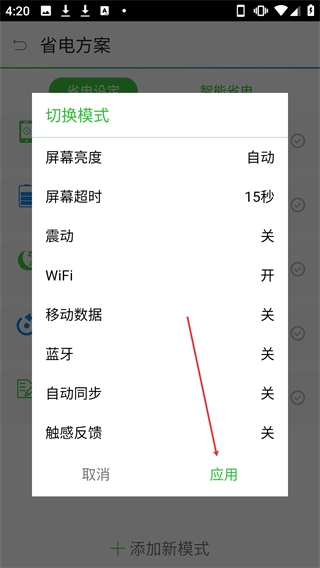 4、在【切换模式】弹窗里,确认好相关设置后点击【应用】按钮,就能回到省电方案页面。