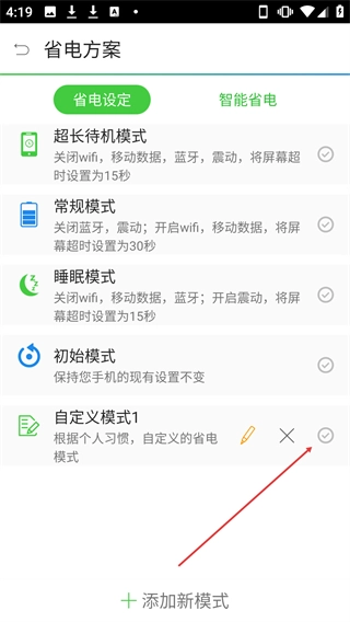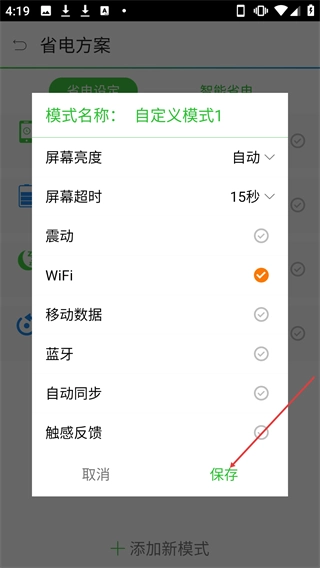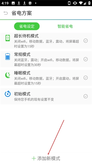 在省电方案页面,点击【添加新模式】选项,即可进入自定义模式的设置页面。