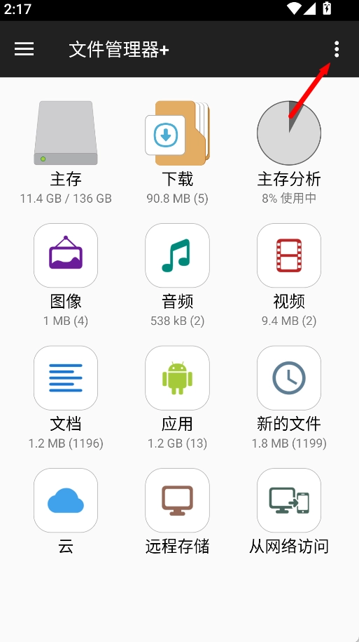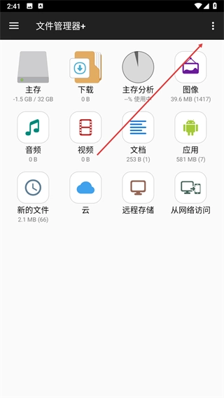 1、打开FM文件管理器应用的首页后,点击页面右上角的三点图标,即可进入更多功能选项界面。