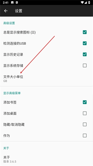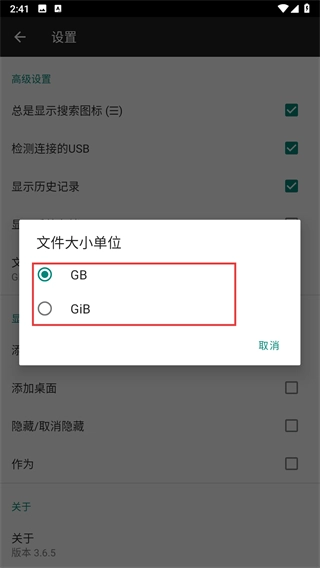 3、找到文件大小单位的相关选项,点击后打开单位选择的弹窗界面。