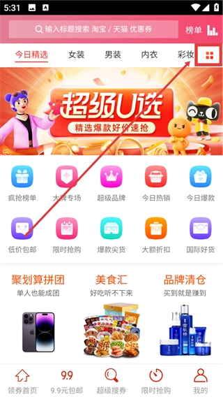 1、在领券首页点击右上角的分类按钮,即可展开全部分类列表,进而选择想要浏览的商品类目。