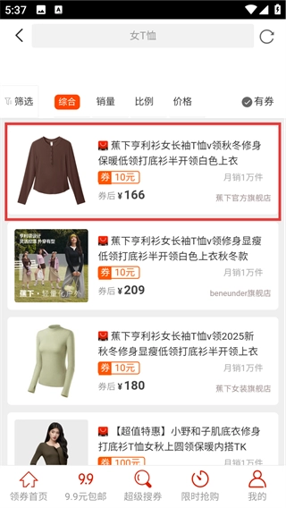 3、选定【女T恤】这一品类后,系统会呈现出对应的商品列表,此时就能看到带有优惠券的商品(例如【蕉下亨利衫女长袖T恤】)了。