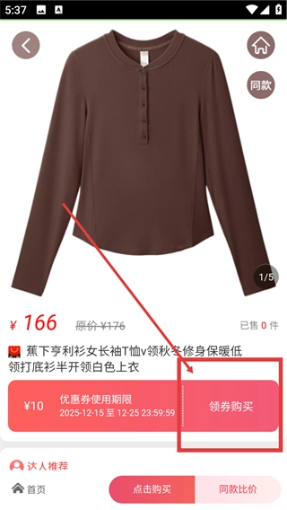 4、进入商品详情页后,点击【领券购买】按钮,即可领取相应优惠券并进入购买流程。