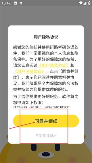 1、进入软件后,先阅读【用户隐私协议】与【用户注册协议】的内容,确认后点击【同意并继续】按钮,即可进入软件主界面。