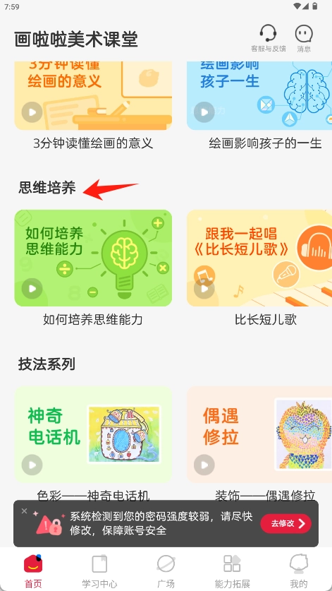 在思维培养板块中找到绿色的课程卡片,点击卡片上的播放按钮即可开启学习。
