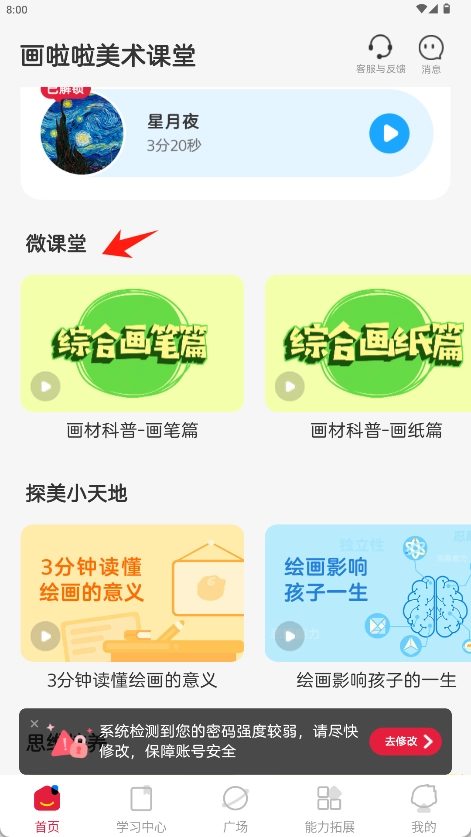 2、通过底部导航栏进入能力拓展微课堂,就能查看画具攻略和热门赛事相关内容。