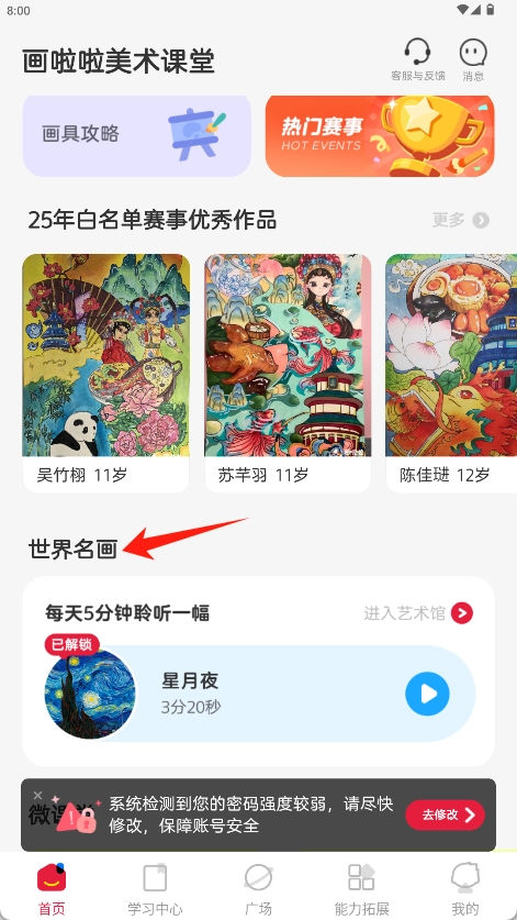 2、能力拓展页面设有画具攻略、赛事资讯以及艺术馆入口,助力拓宽学习边界。