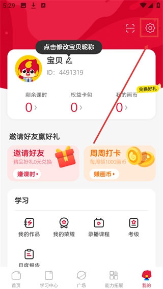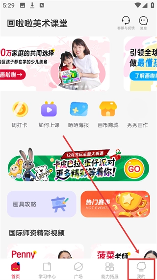 1、点击底部导航栏的【我的】按钮,从【画啦啦美术课堂】首页进入个人中心界面,查看个人相关功能入口。