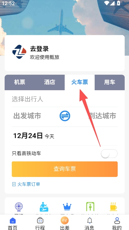 1、启动软件,进入首页后点击火车票选项,切换到对应的服务页面。