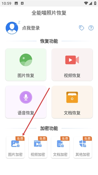 1、找到【加密功能】下标注【免费】的【图片加密】选项,点击该选项可进入图片选择环节。