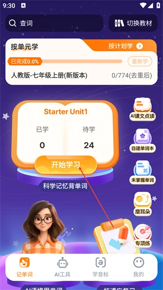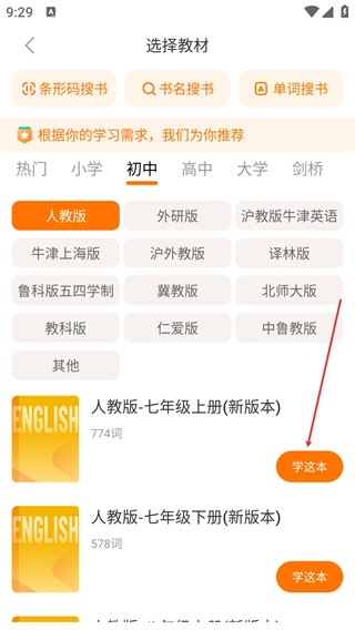 在选择教材的页面,确定好想要学习的目标教材后,点击【学这本】按钮,就能进入该教材对应的学习界面了。